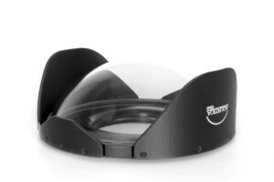 A rugged dome shade is integrated to the design and its extended petals allow the housing to be placed face down, safely keeping the front glass element protected, and a useful characteristic when work, such as battery or memory card replacement on the camera housing is required. The neoprene cover included with this dome port protects the entire surface of the dome.